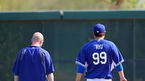[OSEN=글렌데일(애리조나), 이대선 기자] 24일(한국시간) 미국 애리조나주 글렌데일 캐멀벡랜치에서 메이저리그 LA다저스 청백전이 진행됐다. 마운드에서 내려온 류현진이 백팀 3루수 후안 유리베와 이야기를 나누며 경기장을 나