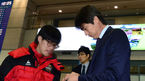[OSEN=인천공항, 지형준 기자] 그리스와의 평가전을 마친 축구대표팀이 7일 오전 인천공항을 통해 입국했다. 홍명보 감독이 인터뷰를 마치고 팬의 사인 요청에 응하고 있다. 홍명보 감독이 이끄는 축구국가대표팀은 6일 새벽 그