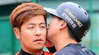 [OSEN=김해, 곽영래 기자] 2014 프로야구 시범경기, 롯데 자이언츠와 두산 베어스의 경기가 12일 오후 김해 상동구장에서 열렸다. 경기에 앞서 롯데 강민호와 장성호가 귓속말을 나누고 있다. 시즌 개막에 앞서 열리는 시범경기는