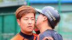[OSEN=김해, 곽영래 기자] 2014 프로야구 시범경기, 롯데 자이언츠와 두산 베어스의 경기가 12일 오후 김해 상동구장에서 열렸다. 경기에 앞서 롯데 강민호와 장성호가 귓속말을 나누고 있다. 시즌 개막에 앞서 열리는 시범경기는