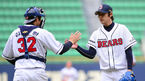 [OSEN=잠실, 백승철 기자] 20일 오후 서울 잠실구장에서 열린 '2014 프로야구 시범경기' 두산 베어스와 한화 이글스의 경기 종료 후 이용찬과 김재환이 하이파이브를 하고 있다. 두산 베어스가 시범경기 첫 연승에 성공했다. 두산은
