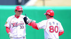 [OSEN=광주, 이대선 기자] 20일 오후 광주KIA챔피언스필드에서 '2014 한국야쿠르트 세븐 프로야구' 시범경기 KIA 타이거즈와 롯데 자이언츠의 경기가 열렸다. 1회말 2사 1,2루에서 KIA 김주형이 좌전 적시타를 치고 김창희 코치와 하이