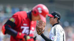 [OSEN=잠실, 지형준 기자] 22일 오후 서울 잠실구장에서 '2014 프로야구 시범경기' LG 트윈스와 KIA 타이거즈의 경기가 열렸다. 2회초 2사 1,2루에서 LG 우규민이 KIA 이범호를 사구로 출루시킨뒤 미안함을 표시하고 있다. 올 해 프로야