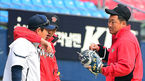 [OSEN=잠실, 곽영래 기자] 10일 오후 서울 잠실야구장에서 열리는 '2014 한국야쿠르트 세븐 프로야구' 두산 베어스와 SK 와이번스의 경기에 앞서 SK 김강민과 조인성이 두산 양의지와 이야기를 나누고 있다. 이날 경기에서 두산과 SK