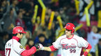 [OSEN=광주, 이대선 기자] 11일 오후 광주KIA챔피언스필드에서 '2014 한국야쿠르트 세븐 프로야구' KIA 타이거즈와 롯데 자이언츠의 경기가 열렸다. 8회말 2사에서 KIA 필이 좌월 솔로홈런을 치고 김종국 코치와 하이파이브를 하고 있