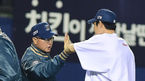 [OSEN=잠실 ,백승철 기자] 12일 오후 서울 잠실구장에서 열린 '2014 한국야쿠르트 세븐 프로야구' LG 트윈스와 NC 다이노스의 경기 종료 후 김경문 감독과 이재학이 하이파이브를 하고 있다. NC가 이재학의 1실점 호투와 테임즈의 3안