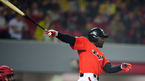 [OSEN=광주, 곽영래 기자] 15일 오후 광주-기아 챔피언스 필드에서 '2014 한국야쿠르트 세븐 프로야구' KIA 타이거즈와 한화 이글스의 경기가 열렸다. 8회초 1사 한화 김회성이 솔로 홈런을 때리고 있다. KIA 한승혁이 한화를 상대로