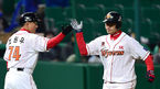 [OSEN=문학, 곽영래 기자] 7일 오후 인천 문학야구장에서 '2014 한국야쿠르트 세븐 프로야구' SK 와이번스와 삼성 라이온스의 경기가 열렸다. 6회말 무사 SK 이재원이 솔로 홈런을 때린 뒤 3루 조원우 코치와 하이파이브를 하고 있다.