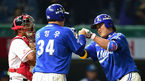 [OSEN=문학, 곽영래 기자] 8일 오후 인천 문학야구장에서 '2014 한국야쿠르트 세븐 프로야구' SK 와이번스와 삼성 라이온스의 경기가 열렸다. 8회초 1사 1루 삼성 박석민이 투런 홈런을 때린 뒤 동료들에게 축하받고 있다. 부상에서