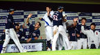 [OSEN=사직, 정송이 기자] 8일 오후 부산 사직구장에서 열린 '2014 한국야쿠르트 세븐 프로야구' 롯데 자이언츠와 두산 베어스의 경기, 4회초 1사 3루투런 홈런을 날린두산 민병헌과홈을 밟은 3루주자 김재호가 덕아웃에서 동료들로