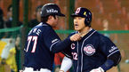 [OSEN=사직, 정송이 기자] 8일 오후 부산 사직구장에서 열린 '2014 한국야쿠르트 세븐 프로야구' 롯데 자이언츠와 두산 베어스의 경기, 8회초 선두타자 홍성흔이 솔로홈런을 날리고 그라운드를 돌면서 전형도 코치와 세레모니를