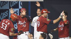 [OSEN=창원, 김영민 기자] 13일 오후 창원시 마산구장에서 열린 '2014 한국야쿠르트 세븐 프로야구' NC 다이노스와 KIA 타이거즈 경기, 8회초 1사 2,3루 필 동점 스리런 홈런을 날리고 덕아웃 동료의 환영을 받고 있다. NC 우완 태드 웨