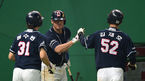 [OSEN=문학, 곽영래 기자] 13일 오후 인천 문학야구장에서 '2014 한국야쿠르트 세븐 프로야구' SK 와이번스와 두산 베어스의 경기가 열렸다. 8회초 2사 만루 두산 김현수가 안타로 득점을 올린 정수빈, 김재호가 칸투와 기뻐하고 있