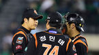 [OSEN=잠실, 지형준 기자] 15일 오후 서울 잠실야구장에서 '2014 한국야쿠르트 세븐 프로야구' LG 트윈스와 롯데 자이언츠의 경기가 열렸다. 7회초 2사에서 LG 정성훈이 롯데 강민호의 파울타구를 놓치고 있다. LG는 우완 류제국이 시