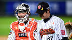 [OSEN=사직,박준형 기자] 16일 오후 부산 사직구장에서 열린 2014 한국야쿠르트 세븐 프로야구 롯데 자이언츠와 넥센 히어로즈의 경기,8회초 1사 1,2루 실점위기를 병살아웃으로 이닝종료 후 롯데 김성배 투수와 용덕한 포수가 이야