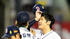 [OSEN=잠실, 지형준 기자] 17일 오후 서울 잠실야구장에서 '2014 한국야쿠르트 세븐 프로야구' 두산 베어스와 NC 다이노스의 경기가 열렸다. 8회말 2사 3루에서 두산 김재호가 역전 1타점 좌전 적시타를 날리고 전상렬 코치와 기뻐하