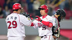 [OSEN=광주, 이대선 기자] 20일 오후 광주-KIA챔피언스필드에서 '2014 한국야쿠르트 세븐 프로야구' KIA 타이거즈와 LG 트윈스의 경기가 열렸다. 5회말 1사 만루에서 KIA 이범호가 만루 홈런을 치고 홈에서 나지완과 하이파이브를 하고