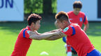 [OSEN=파주, 민경훈 기자] 21일 오후 경기도 파주시 파주 NFC(대표팀 트레이닝센터)에서 브라질 월드컵에서 사상 첫 원정 8강에 도전하는 축구 국가대표팀이 훈련 중 손흥민과 김신욱이 함께 몸을 풀고 있다. 한편 대표팀은 지난 12