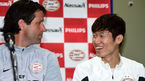 [OSEN=수원월드컵경기장, 곽영래 기자] 은퇴를 선언한 '영원한 캡틴' 박지성의 아인트호벤 내한경기 기자회견이 21일 오전 수원월드컵경기장에서 열렸다. 박지성과 에르네스트 파베르 PSV 수석코치가 포토타임을 갖고 있다. 박지