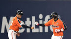 [OSEN=목동, 민경훈 기자] 22일 오후 서울 목동구장에서 열린 ‘2014 한국야쿠르트 세븐 프로야구’ 넥센 히어로즈와 한화 이글스의 경기, 8회초 선두타자 한화 정범모가 우월 솔로 홈런을 날린 후 3루에서 이종범 코치와 하이파이