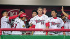 [OSEN=광주, 이대선 기자] 22일 오후 광주-KIA챔피언스필드에서 '2014 한국야쿠르트 세븐 프로야구' KIA 타이거즈와 LG 트윈스의 경기가 열렸다. 7회말 무사에서 KIA 박기남이 좌월 솔로 홈런을 치고 더그아웃에서 동료들과 환호하고