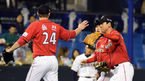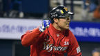 [OSEN=목동, 민경훈 기자] 22일 오후 서울 목동구장에서 열린 ‘2014 한국야쿠르트 세븐 프로야구’ 넥센 히어로즈와 한화 이글스의 경기, 6회초 2사 주자 1,2루 한화 송광민의 1타점 적시타때 홈을 밟은 정근우가 덕아웃에서 동료