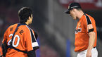 [OSEN=울산, 곽영래 기자] 23일 오후 울산 문수야구장에서 '2014 한국야쿠르트 세븐 프로야구' 롯데 자이언츠와 KIA 타이거즈의 경기가 열렸다. 8회말 1사 1,3루 롯데 유먼이 KIA 이대형을 병살로 잡아낸 뒤 정훈과 하이파이브를 하고