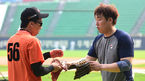 [OSEN=잠실,박준형 기자] 23일 오후 서울 잠실구장에서 열린 2014 한국야쿠르트 세븐 프로야구 두산 베어스와 한화 이글스의 경기전 두산 김현수가 한화 고동진에게 글러브를 전달하고 있다. 이날 두산과 한화는 유희관과 앨버스