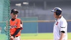 [OSEN=울산, 곽영래 기자] 23일 오후 울산 문수야구장에서 열리는 '2014 한국야쿠르트 세븐 프로야구' 롯데 자이언츠와 KIA 타이거즈의 경기에 앞서 롯데 강민호가 번트훈련을 하던 도중 김시진 감독과 이야기를 나누고 있다. 롯데