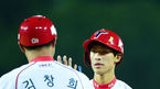 [OSEN=광주, 민경훈 기자] 29일 오후 광주-KIA 챔피언스필드에서 열린 2014 한국야쿠르트 세븐 프로야구 KIA와 두산의 경기, 4회말 1사 주자 2,3루 KIA 강한울이 중견수 앞 1타점 적시타를 날린 후 1루에서 김창희 코치와 하이파이브를
