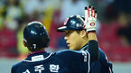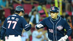 [OSEN=광주, 민경훈 기자] 29일 오후 광주-KIA 챔피언스필드에서 열린 2014 한국야쿠르트 세븐 프로야구 KIA와 두산의 경기, 7회초 무사 1루 두산 김현수가 우월 투런 홈런을 날린 후홈에서최주환과 기쁨을 나누고 있다. 이 날 경기에