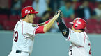 [OSEN=광주, 민경훈 기자] 29일 오후 광주-KIA 챔피언스필드에서 열린 2014 한국야쿠르트 세븐 프로야구 KIA와 두산의 경기, 4회말 2사 주자 1루 KIA 나지완이 투런홈런을 날린 후 3루에서 김종국 코치와 하이파이브를 하고 있다. KIA 우