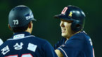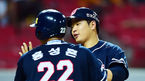 [OSEN=광주, 민경훈 기자] 29일 오후 광주-KIA 챔피언스필드에서 열린 2014 한국야쿠르트 세븐 프로야구 KIA와 두산의 경기, 4회초 2사 주자 2,3루 두산 김재호의 좌익수 앞 2타점 적시타때 홈을 밟은 홍성흔과 김재환이 하이파이브를
