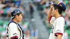 [OSEN=잠실, 최규한 기자] 1일 오후 서울 잠실야구장에서 '2014 한국야쿠르트 세븐 프로야구' 두산 베어스와 롯데 자이언츠의 경기가 열렸다. 3회초 롯데 공격 2사 만루 상황 두산 선발 노경은과 포수 양의지가 대화를 나누고 있다.
