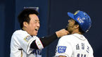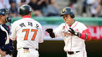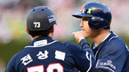 [OSEN=인천, 이대선 기자] 4일 오후 인천 문학야구장에서 '2014 한국야쿠르트 세븐 프로야구' SK 와이번스와 두산 베어스의 경기가 열렸다. 3회초 2사 1,2루에서 두산 홍성흔이 좌전 적시타를 치고 전상렬 코치와 하이파이브를 하고