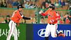 [OSEN=부산, 지형준 기자] 5일 오후 부산 사직구장에서 '2014 한국야쿠르트 세븐 프로야구' 롯데 자이언츠와 한화 이글스의 경기가 열린다. 7회초 무사에서 한화 김태균이 솔로포를 날리고 그라운드를 돌며 이종범 코치와 하이파