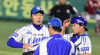 [OSEN=대구, 최규한 기자] 5일 오후 대구구장에서 '2014 한국야쿠르트 세븐 프로야구' 삼성 라이온즈와 KIA 타이거즈의 경기가 열렸다. 5회초 KIA 공격 1사 1, 2루 상황 삼성 선발 배영수가 포수 이지영, 김태한 코치와 대화를 나누고