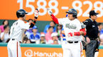 [OSEN=대전, 지형준 기자] 6일 오후 대전 한밭야구장에서 '2014 한국야쿠르트 세븐 프로야구' 한화 이글스와 삼성 라이온즈의 경기가 열렸다. 5회말 2사 2루에서 한화 김태균이 투런포를 날리고 정근우의 축하를 받고 있다. SK에서