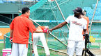 [OSEN=대전, 지형준 기자] 6일 오후 대전 한밭야구장에서 '2014 한국야쿠르트 세븐 프로야구' 한화 이글스와 삼성 라이온즈의 경기가 열린다. 한화 조인성과 피에가 인사를 나누고 있다. SK에서 한화로 이적한 베테랑 포수 조인성은