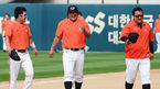 [OSEN=광주,박준형 기자] 10일 광주-기아챔피언스필드에서 열린 2014 한국야쿠르트 세븐 프로야구 KIA 타이거즈와 한화 이글스의 경기에 앞서 스트레칭을 마친 한화 정근우와 김태균, 조인성이 이야기를 나누며 더그아웃으로 들어