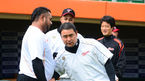 [OSEN=사직,박준형 기자] 12일 오후 부산 사직구장에서 열리는 2014 한국야쿠르트 세븐 프로야구 롯데 자이언츠와 LG 트윈스의 경기에 앞서 전날 경기에서 충돌했던 롯데 히메네스와 LG 최경철이 이야기를 나누고 있다. 이날 경기에