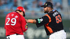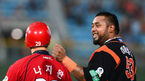 [OSEN=사직,박준형 기자] 13일 부산 사직구장에서 열린 2014 한국야쿠르트 세븐 프로야구 롯데 자이언츠와 KIA 타이거즈의 경기,8회초 투수교체때 1루 주자 나지완과 1루수 히메네스가 장난을 치고 있다 이날 경기에서 롯데와 KIA는