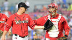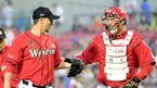 [OSEN=잠실, 최규한 기자] 13일 오후 서울 잠실구장에서 '2014 한국야쿠르트 세븐 프로야구' LG 트윈스와 SK 와이번스의 경기가 열렸다. 5회말 LG 공격을 삼자범퇴로 막아낸 SK 선발 울프와 포수 이재원이 인사를 나누며 더그아웃으로