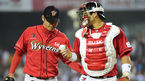 [OSEN=잠실, 최규한 기자] 13일 오후 서울 잠실구장에서 '2014 한국야쿠르트 세븐 프로야구' LG 트윈스와 SK 와이번스의 경기가 열렸다. 9회말 LG 공격 때 마운드에 올라 2실점하며 블론세이브한 SK 투수 박희수와 포수 정상호가 더그