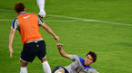 [OSEN=브라질 이구아수, 민경훈기자] 12일 오후(현지시간) 홍명보감독이 이끄는 축구대표팀이 이구아수(이과수)의 페드로 바소경기장에서 훈련 중 구자철이 태클을 하고 있다. 한편 브라질 월드컵은 오는 13일 새벽 5시(한국시간)