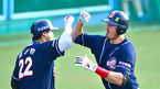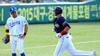 [OSEN=대구,박준형 기자] 15일 오후 대구구장에서 열린 2014 한국야쿠르트 세븐 프로야구 삼성 라이온즈와 두산 베어스의 경기,2회초 두산 선두타자 칸투가 선취 솔로홈런을 날리고 홍성흔과 하이파이브를 하고 있다 이날 경기에