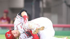 [OSEN=광주, 김영민 기자] 17일 오후 광주 챔피언스필드에서 열린 '2014 한국야쿠르트 세븐 프로야구' KIA 타이거즈와 넥센 히어로즈의 경기, 7회말 2사 1,2루 안치홍 왼쪽 무릎에 몸에 맞는 공을 맞고 괴로워하고 있다. 넥센은 헨리