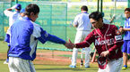 [OSEN=대구, 지형준 기자] 24일 오후 대구시민운동장 야구장에서 '2014 한국야쿠르트 세븐 프로야구' 삼성 라이온즈와 넥센 히어로즈의 경기가 열린다. 경기에 앞서 삼성 나바로가 NC 테임즈의 수염 세레모니를 따라하며 즐거워하