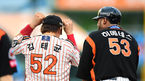 [OSEN=대전, 지형준 기자] 26일 오후 대전 한밭야구장에서 '2014 한국야쿠르트 세븐 프로야구' 한화 이글스와 롯데 자이언츠의 경기가 열렸다. 1회초 한화 타투스코가 수비를 마치고 더그아웃으로 향하며 정범모와 주먹을 맞대고