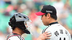 [OSEN=인천, 백승철 기자] 28일 오후 인천 문학구장에서 열린 '2014 한국야쿠르트 세븐 프로야구' SK 와이번스와 LG 트윈스의 경기 5회말 1사 2,3루 류제국이 강상수 코치와 이야기를 나누고 있다. SK는 고효준을 선발 내세웠다. 올 시